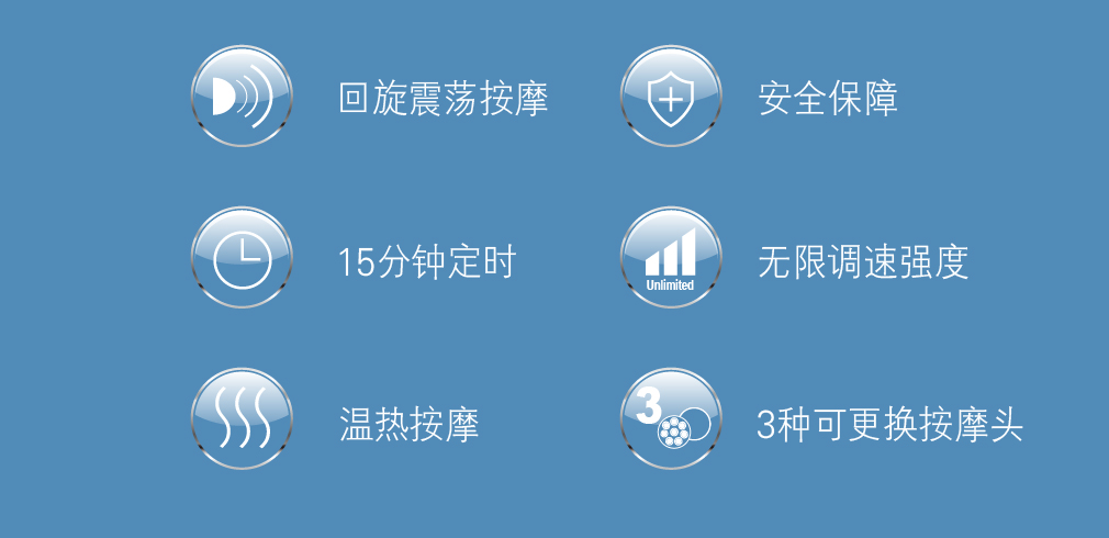 三个可更换按摩头:波浪型﹑风扇型﹑滚珠型。