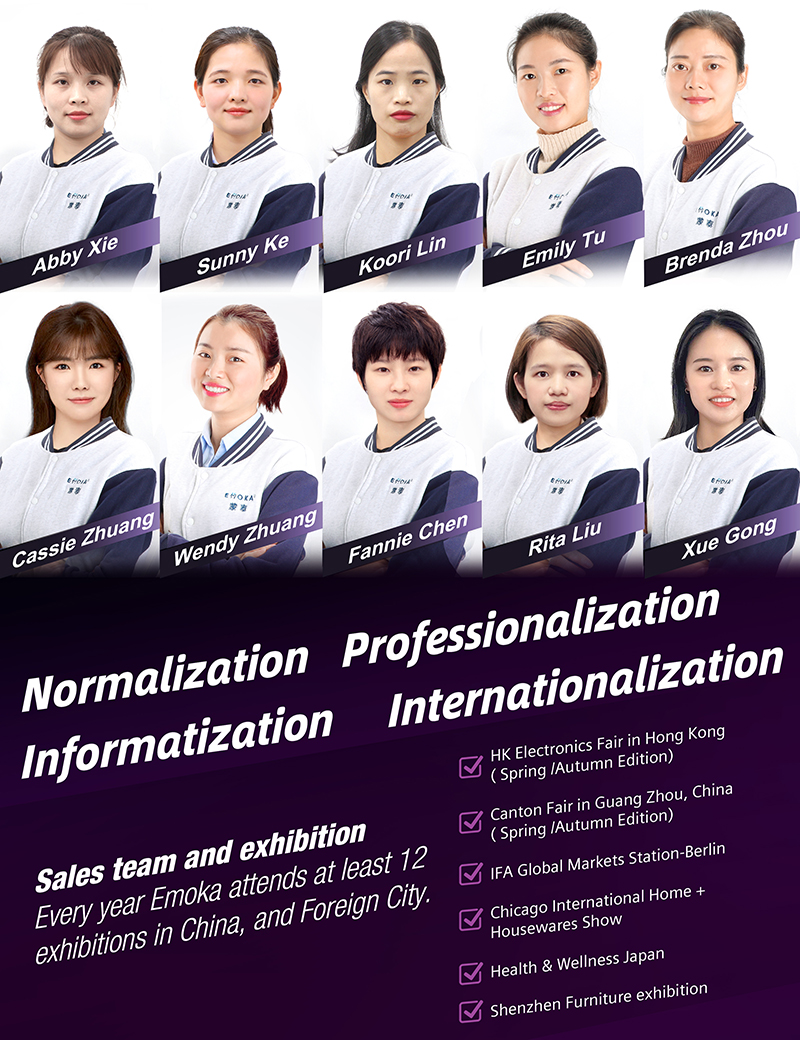 In recent years, EMOKA has been actively exploring domestic and international markets, vigorously developing its own brands and stepping out of its own sales characteristics. Under the guidance of continuous innovation concept, EMOKA has its unique design and R & D technology, excellent production capacity and rich manufacturing experience, prospering day by day. In the future, strive for the development of the company at the same time, we will combine the medical, beauty theory and technology into massager, adhering to the principle of "high-quality products, keep improving, create health and benefit mankind", making contribution to human health so as to let EMOKA deep into every family.