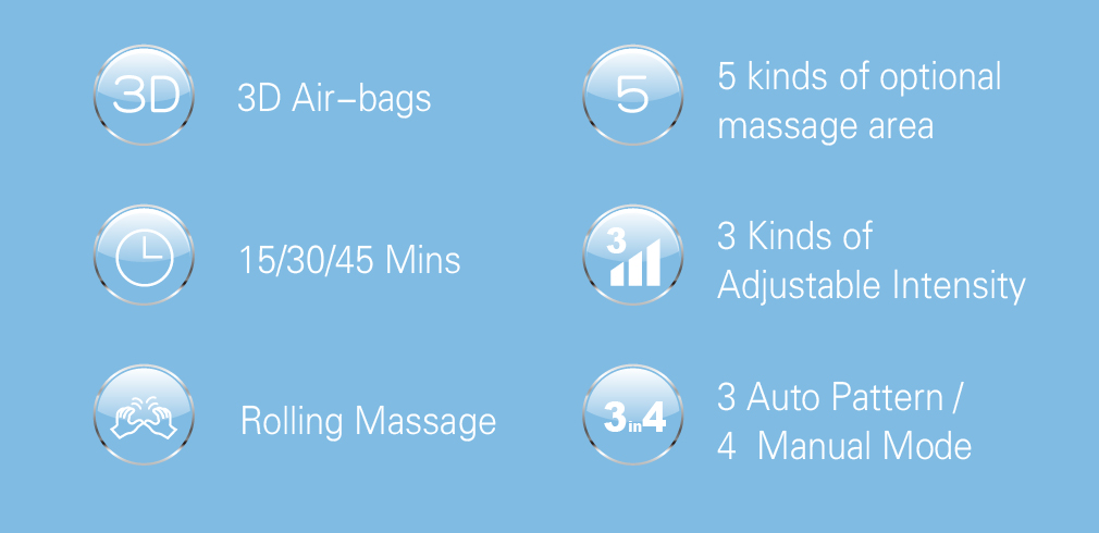 * 33 3D air-bags use rubbing and tapping to massage the neck, shoulder, waist, back, buttocks and leg.