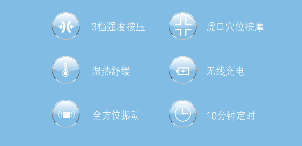 • 全方位振动、温感热敷、按摩手掌并针对虎口穴位按摩。